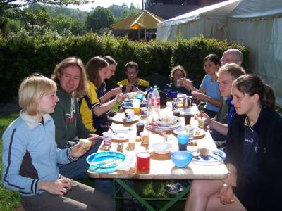 …wurden wir irgendwann von dem monotonen Geräusch der niederprasselnden Tropfen auf unseren Zelten geweckt, aber daran sollten wir uns noch gewöhnen. Der erste Trupp wurde ausgesandt um das Frühstück zu erkunden und auch wenn Alex ohne Nutella zufrieden sein musste und Felix' Geschmacksnerven schwer durch Schweizer Joghurt geschädigt wurden, konnten wir alle gestärkt unserem ersten Gegner entgegentreten. Discterics, ein Spanisches Team, wir waren bereit sie zu schlagen, hatten schließlich schon ein Jahr zuvor unserer Spionin Eva ausgesandt um sie auszukundschaften. Doch wir waren nicht eingespielt, noch nicht so richtig bei der Sache. Verloren immer wieder Scheiben, der Wind und der anhaltende Regen erschwerten unser Spiel zusätzlich. Wir stellten zwar erfolgreich eine Zone und holten die Defence, aber die Aufholjagd begann zu spät und das erste Spiel war damit 9:6 verloren. Wir zogen uns ins Trockene zurück, unsere Coach Christoph stellt klar, dass wir die bessere Mannschaft waren und der Wille war da, das nun auch zu zeigen. Die Hoffung, dass der Regen irgendwann aussetzen würde, wurde begraben, die nassen Schuhe wieder angezogen und auf zur nächsten Attacke. Ultimate Vibration galt es diesmal zu bekehren. Das Spiel fing gut an, Christophs Worte waren noch allem im Hinterkopf, wir gingen mit 3:1 in Führung. Die Gegner waren eingeschüchtert, aber leider fing es dann auch bei uns an zu bröckeln. Es fehlte an Kondition, damit an Konzentration und so kamen die Fehler (Zitat: der Trainer). Ein Spiel das von vielen Turns geprägt war, die Gegner konnten das für sich nutzen, bei uns allerdings häuften sich die Missverständnisse. Wir stellten immer wieder sowohl Offence als auch Defence um. Es gab noch ein paar schöne Punkte und Marvin unser zweiter EM-Stuttgarter hatte sein Debüt. Doch den Sieg mussten wir abgeben. Danach zeigte uns Sepp, zum besten Spieler erwählt, noch eine Tanzeinlage und verwirrte damit ein französisches Mädel so, dass sie selbst nicht mehr wusste wie ihr Spiel ging. Judith hatte wie immer den Plan und führte uns sicher zu Feld sieben, wo nach einem Spiel Pause die Gastgeber persönlich auf uns trafen. Der Start war gelungen, ein Spielstand von 2:2 erreicht, und dann… Kondition, Konzentration, Fehler… das hatten wir ja eben schon… 15:7 Aber schließlich hatten die Wizards Heimvorteil und zu guter letzt war mit uns, zumindest für kurze Zeit, der Regen besiegt. Dann hieß es Energiespeicher wieder auffüllen, heiß duschen (na ja, nass waren wir ja schon den ganzen Tag), Geier holen, Marvin Geldscheine für sein exklusives Hobby geben, Invalidenvereinvorstandswahl und warten dass es um 20Uhr was Warmes zu Essen gab. Um 22Uhr konnten wir dann noch beim night game ein paar rote und grüne „Glühwürmchen“ bewundern die hinter einer blauen Scheibe hergelaufen sind. Die kaputte Rückenfraktion, Markus und Maze, verzogen sich schnell in ihre Zelte und auch die übrigen trotten einer nach dem anderen noch ein letztes Mal für diesen Tag über die Felder und verkrochen sich in ihren Schlafsäcken. Die Stimmung im Partyzelt war zwar klasse, aber schließlich reichte die Musik auch bis zu unseren Zelten.