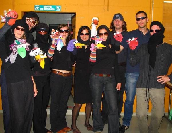 Am Abend haben wir uns auf die Party vorbereitet, während Karo uns bekochte – die Handpuppen unseres Kostüms mussten erst gebastelt werden. Die Resultate sind auf der Foto-Galerie zu begutachten. Die Puppen sollten im Vordergrund stehen, daher waren wir ganz in schwarz gekleidet und vermummt. Dazu noch ne Sonnenbrille und fertig war das Gartenhäuschen. Clou des Ganzen war noch ein Schlauch, der von Puppe, am Arm entlang zum Mund geführt war. Bei der Party angekommen (Bus - doch nicht Bus - Bus? - schließlich Straßenbahn), machten sich einige auf zu Raubzügen und tranken den anderen Leuten mehr oder weniger unerkannt ihre Drinks weg. Besonders stachen da Felix und Kata heraus („Bei den schwulen Engeln ist das viel zu einfach… .“), die Inga als Ablenkung aufstellten und sich den gesamten Abend keinen eigenen Drink kauften. Felix schaffte es einmal, einen von zwei gerade erstandenen Tequila zu rauben und – das ist das Beste – sich danach aus dem Staub zu machen. Mundraub ist nicht strafbar, oder? Party ansonsten ganz nett, viel getanzt wurde von unserer Seite - glaube ich - nicht. Gegen halb drei machten sich die Letzten auf zum Shuttlebus – am Bunker schlug Felix sich kurz in die Büsche.